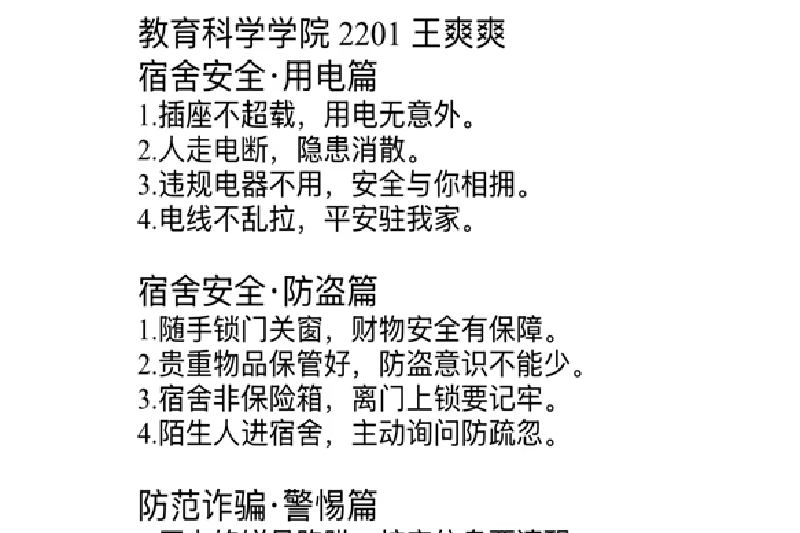 活动一“安全标语我来创,平安校园共守护”中,同学们紧扣宿舍用电安全、防盗防诈骗等主题,创作12-20字原创标语,“宿舍用电守规范,平安相伴每一天”“警惕诈骗陷阱,守护财产安全”等作品简洁有力、朗朗上口,既贴合校园生活又具警示意义。