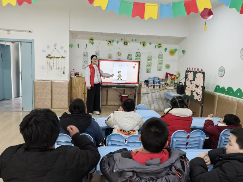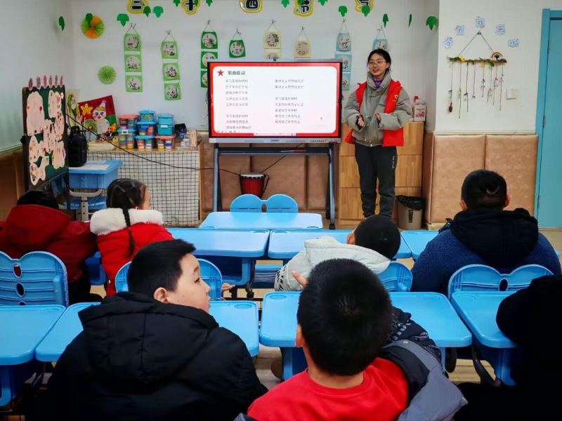 最后,活动进入最温暖的环节——学唱《学习雷锋好榜样》歌曲。“学习雷锋好榜样,忠于革命忠于党……”熟悉的旋律响起,起初,孩子们只是静静地听着,但随着旋律一遍遍重复,有的孩子开始尝试跟着哼唱。有的虽然不会唱,但是都不自觉地跟着节奏轻轻晃动身体。志愿者们用鼓励的眼神和掌声给予回应。那一刻,歌声虽不整齐,却格外动人——它不仅是旋律的传递,更是爱与希望的共鸣。