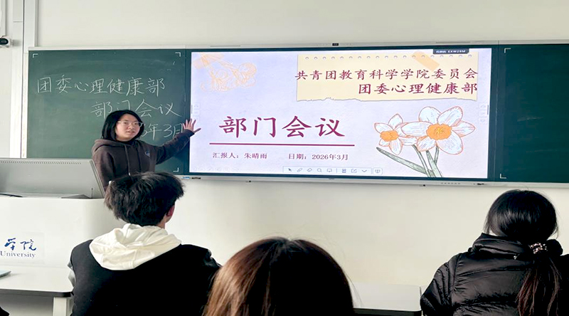 教科院3月11日电(记者 唐锐然 刘倩雯)为明晰新学期工作重点,提升部门工作效率与凝聚力,推进学院心理健康教育工作有序开展、提质增效,教育科学学院团委心理健康部于2026年3月11日在崇文楼1-106教室召开了部门工作会议。会议由心理健康部部长朱晴雨主持,教科院团委心理健康部部分干事参与本次会议。