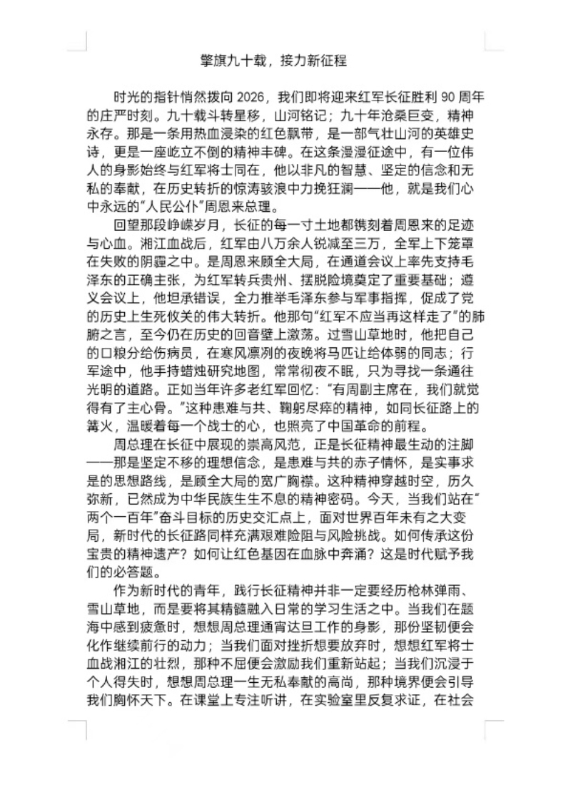 以笔墨寄情,以文字致敬。此次征文活动不仅重温了长征路上的峥嵘岁月,更深刻缅怀了总理为国为民的赤子情怀。愿这份红色记忆与崇高精神永远激励我们在新时代的征程中勇毅担当、续写荣光!