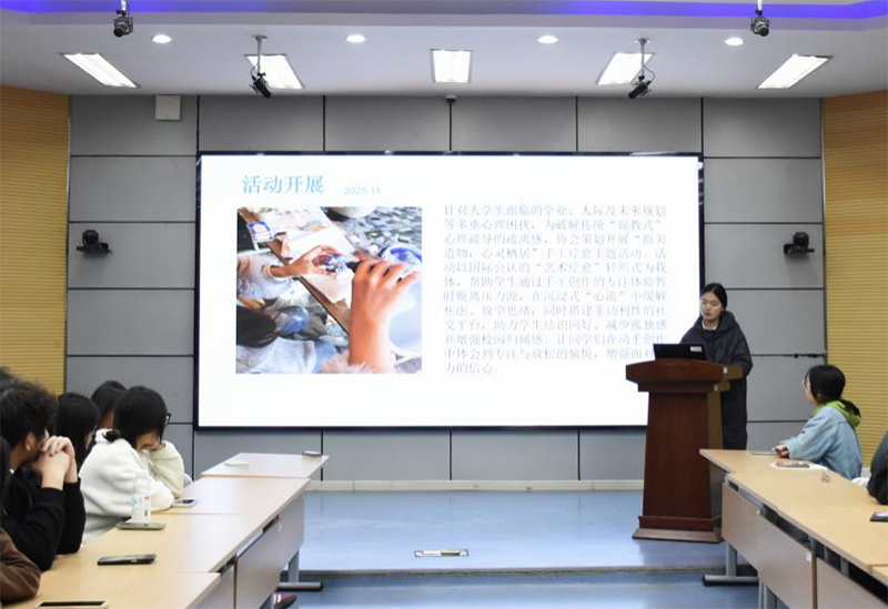 博爱心理健康协会会长韩晗同学围绕协会活动组织、部门工作情况以及工作展望三个方面展开发言。她表示,协会将结合本次座谈调研成果,深耕专业心理服务,创新活动形式、丰富服务内容,精准对接学生心理需求,成为一个可信可靠的心灵港湾。