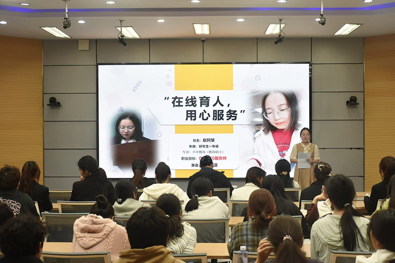 随后,封翎同学带来了职业规划示范展示。她以“恪守师者初心,点亮山区群星”为主题,围绕职业目标、实践行动、优化提升三个核心维度展开分享。分享中,她将个人成长故事与教育理想结合,用细腻的讲述展现了对山区教育事业的热忱,她的分享既有对教育初心的坚守,也有对职业发展的理性思考,让在场同学直观感受到一份优秀职业规划的力量,也为大家如何结合自身专业、锚定职业方向、打磨参赛作品提供了生动示范与务实参考。