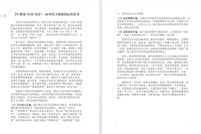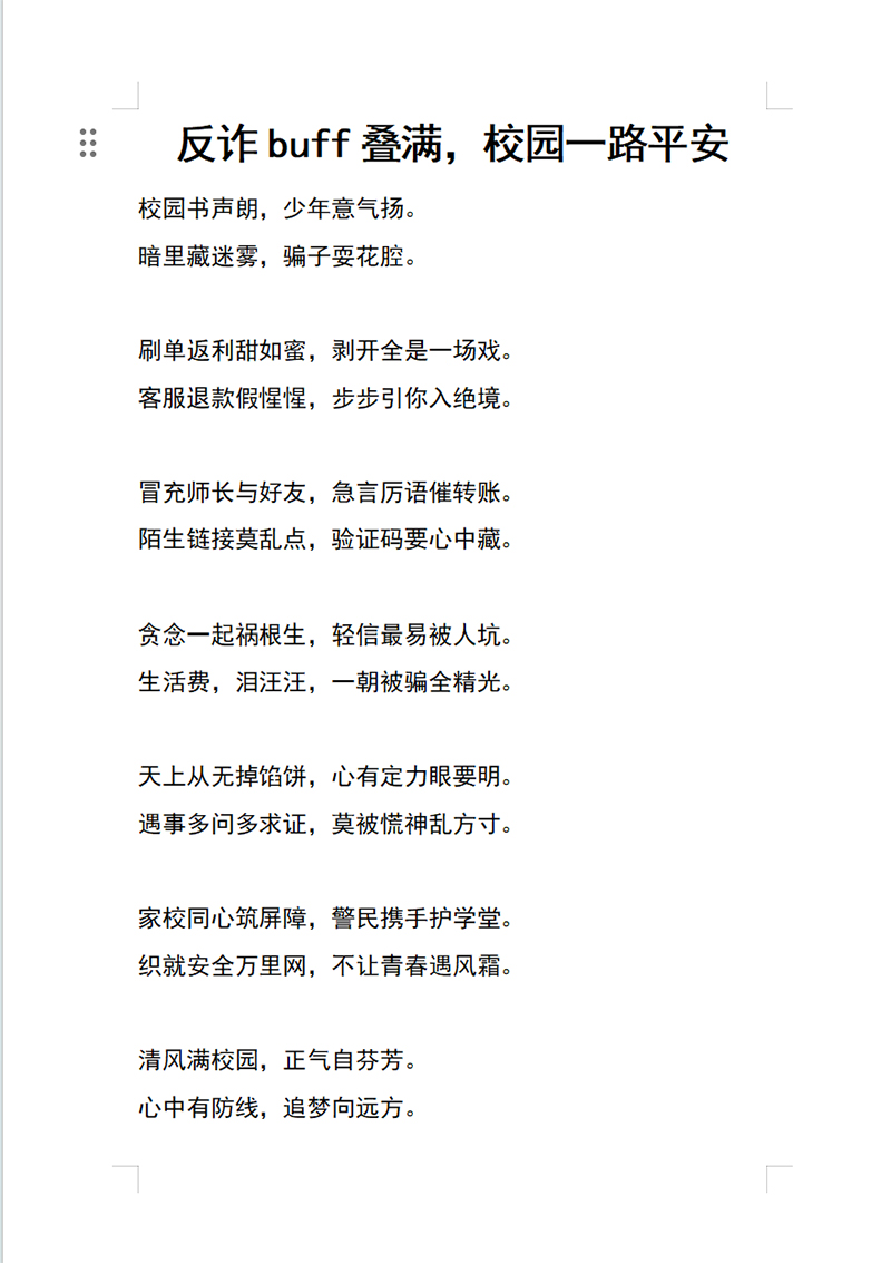 在“反诈心声,笔尖传防”主题征文大赛中,参赛学生围绕校园反诈核心主题自由创作,文体涵盖记叙文、议论文、散文、诗歌、反诈小故事等多种形式。大家结合自身认知、身边真实案例与社会反诈热点,深入剖析刷单返利、校园贷、冒充身份等校园常见诈骗套路,讲述反诈感悟、分享实用防范方法,用文字传递反诈正能量,所有征文均为原创作品且字数达标,以Word文档形式规范线上提交。