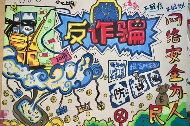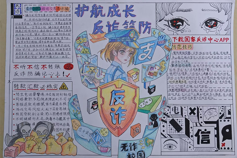 在“反诈绘心,妙笔宣防”主题手抄报创作大赛中,学生们以A4画纸为载体,通过手绘、彩铅、马克笔等形式自主设计版面,将反诈主题标题、校园典型诈骗类型科普、对应防范技巧、反诈宣传标语等内容融入作品,搭配漫画、插画等元素让宣传内容更加生动。作品坚持手绘原创,可个人或3人以内小组参与,完成后以清晰高清图片形式提交,充分展现了学生的创意与反诈宣传热情。活动全程严格落实原创、格式、提交时间等要求,评委由学院教师及学生组织负责人共同组成,以打分统分的方式保证评审公平、公开、透明。
