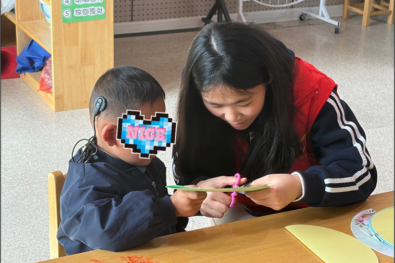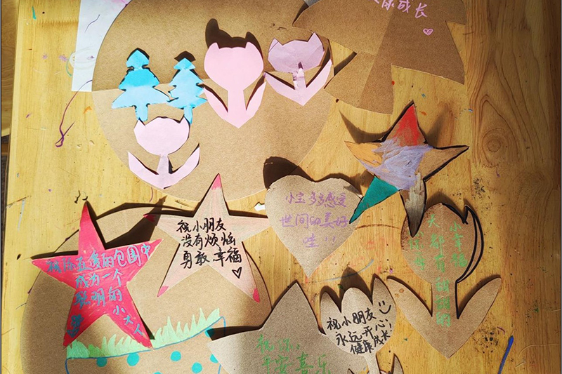 随后的手工创作环节,成了孩子们与地球的温柔对话。志愿者们手把手陪着孩子们,用彩纸裁剪出花朵、树木与星星,用画笔为它们添上斑斓的色彩,再在小小的图案背面,写下对地球的祝福,也写下对自己的期许。“平安喜乐,快乐加倍”“天天开心,健康成长”,一笔一画,都是最纯粹的心意;剪刀开合间,纸花悄然绽放,像极了孩子们眼里藏不住的欢喜。志愿者们弯着腰,陪着孩子们慢慢剪、细细贴,每一次耐心的指引、每一句温柔的鼓励,都让小小的活动室里,溢满了融融暖意。