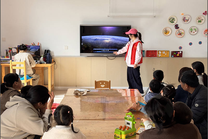活动伊始,志愿者们以动画短片为序,为孩子们展开了一幅蔚蓝星球的画卷。屏幕上,云卷云舒的天空、碧波荡漾的海洋、生机盎然的森林缓缓铺展,志愿者们用温柔的声音,将地球的故事娓娓道来。从四季流转的奥秘,到万物共生的美好,从一草一木的珍贵,到低碳生活的意义,那些关于守护家园的小小道理,被揉进了生动的画面与亲切的讲述里,悄悄住进了孩子们的心里。