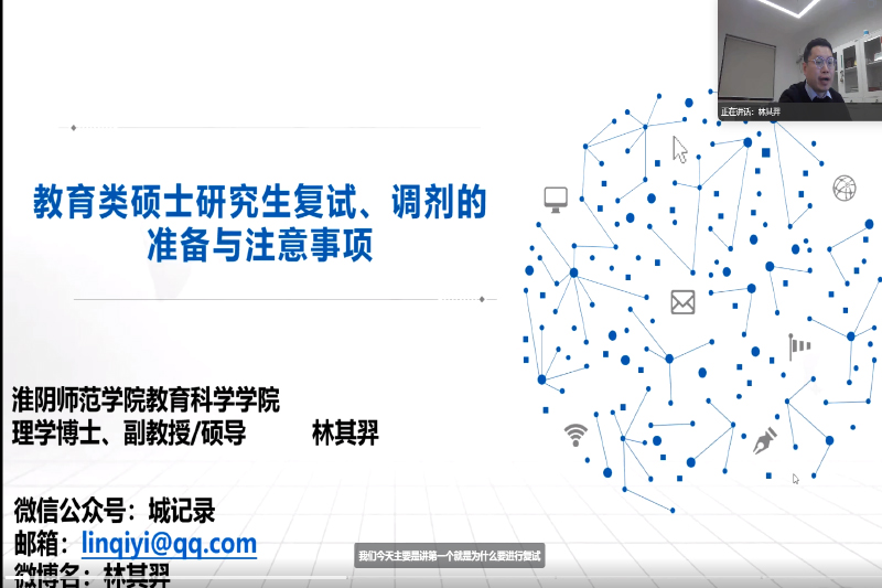 教科网3月19日电(记者 吴悦 高灿)为切实帮助考研学子明晰复试备考重点、熟练掌握调剂策略、全面提升应试综合能力,3 月 19 日晚,淮阴师范学院教育科学学院依托腾讯会议平台,精心举办 2025 届考研复试线上指导会议。本次会议特邀学院理学博士、副教授、硕士生导师林其羿担任主讲嘉宾,学院 2025 届备战考研复试的学子齐聚云端,参与本次专题指导。